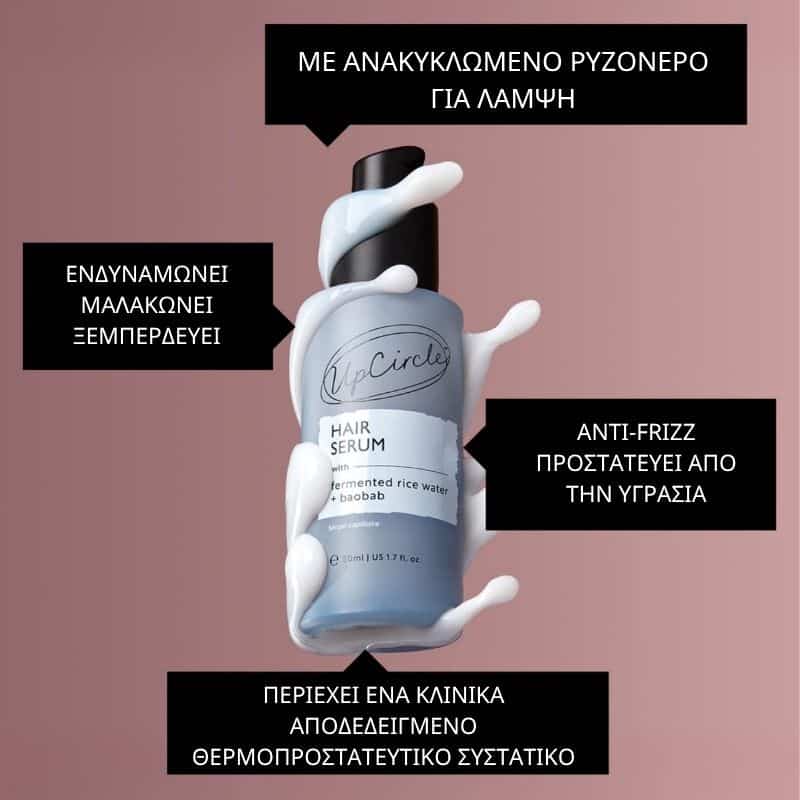Leave-in serum μαλλιών της UpCircle: με ρυζόνερο που έχει υποστεί ζύμωση (fermented organic rice water), ανακυκλωμένο εκχύλισμα baobab, εκχύλισμα μανιταριού, υαλουρονικό οξύ και φρουκτόζη.